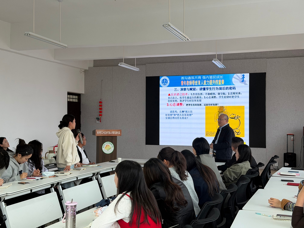 讲座全程氛围轻松热烈,涂俊礼老师语言诙谐幽默,结合真实育人案例,融合教育理论、心理常识与相关法律法规开展讲解。培训过程中,涂老师还与在场青年教师亲切互动,耐心解答大家在日常带班、家校沟通中遇到的实际困惑,现场交流氛围浓厚,老师们收获满满、深受启发。