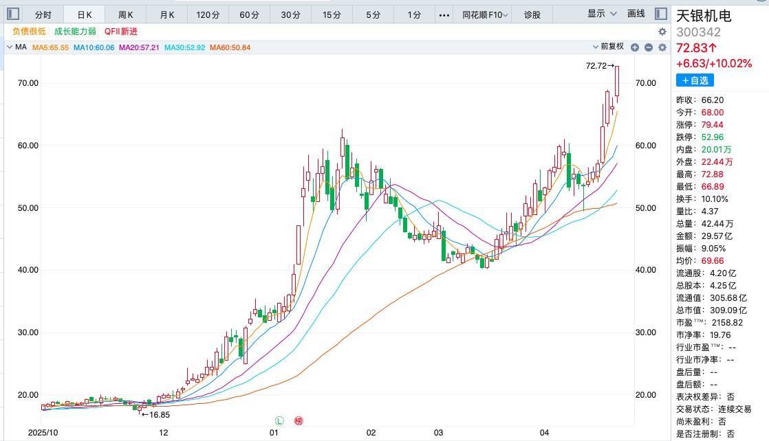 就天银机电而言,该股为A股商业航天板块的大牛股。今年年初,其股价从30元/股左右一路上涨,截至4月23日发稿,其股价报72.83元/股,年初至今股价累计涨近120%。